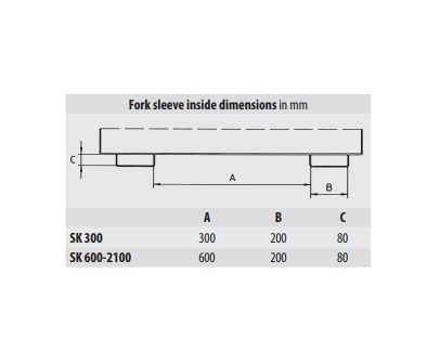 Model | Volume (m³) | Dimensions (L×W×H mm) | Max Load (kg) | Weight Painted/Galv. (kg) | Fork Sleeves (A×B×C mm) |
