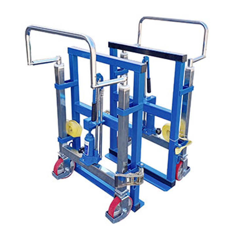Features | Lift cylinders with pump handle, rubber pads, double supported frame, steerable PU castor wheels with bearings, 5 m fixing straps |