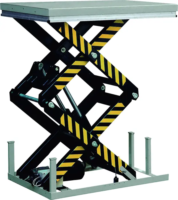 Tables for high lifts and long goods. Table should be fixed into floor with bolted joints. Maintenance free pivot bushings. Large safety clearance between the scissors to avoid injuries. Lift cylinder with internal drainage. Safety valve to ensure safety in case of a hose burst. Low-noise power pack with built-in overload valve. Safety switch in top position. Moveable limit switch for adjusting full raised stop. 4 end-stops, incl. 4 loops which can be used e.g. when lifting total lift table into a pit. Low-noise power pack with built in overload valve. Cable for 3-phase connection 380V/16 Ah. Approves to EN1570-1.