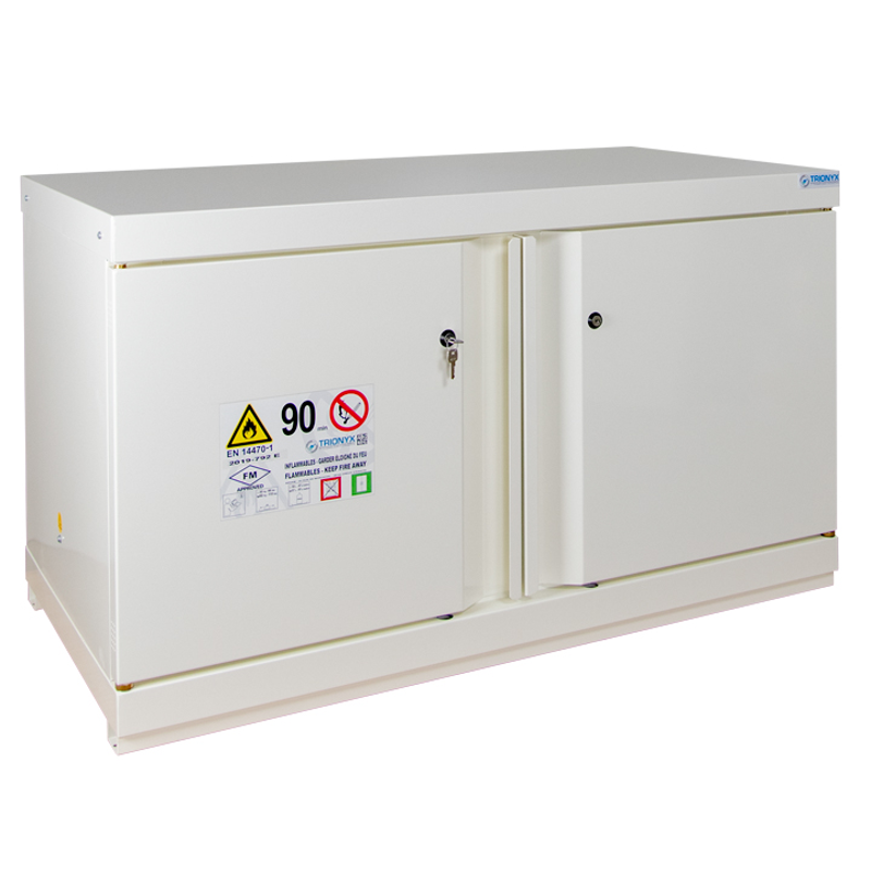 Fire-rated multi-hazard safety cabinet with 90-minute resistance, compliant with EN 14470-1. Secure under-counter chemical storage with containment sump and self-closing doors.