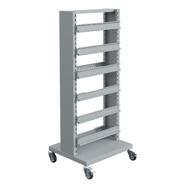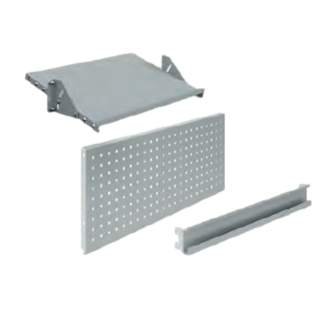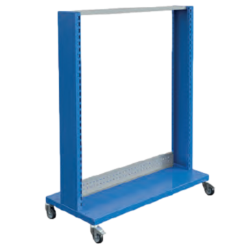 Structure only: the base is made from 25/10th thick folded sheet steel, with two uprights made from 12/10th thick folded sheet steel featuring 10x16mm perforations on the inner side and 30x10mm perforations on the front and rear faces, spaced at a 50mm pitch. The cross-member, available in light grey RAL 7035 only, is made from 12/10th thick folded sheet steel. The entire structure is assembled using screws. Equipped with 4 swivel castors, 2 of which with brake, diameter 100mm.Maximum load capacity: 200kg.